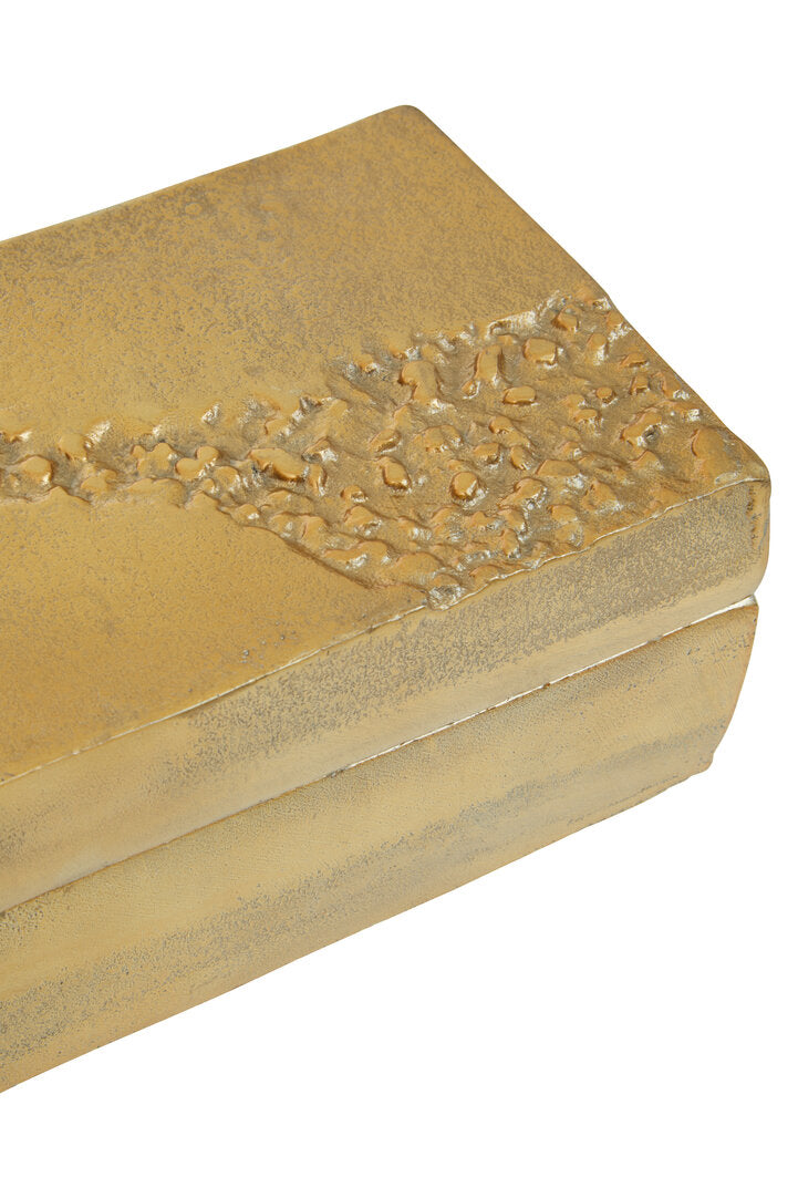 A refined blend of structure and shine, this contemporary trinket box adds a warm, sophisticated accent to modern home styling. The golden exterior brings a subtle radiance that pairs beautifully with luxury home décor, sculptural furniture and premium materials like marble, stone and rich woods. Its clean, elongated silhouette introduces an elegant architectural note, making it a natural addition to sideboards, console tables or curated dressing-table displays where understated glamour enhances the composition.