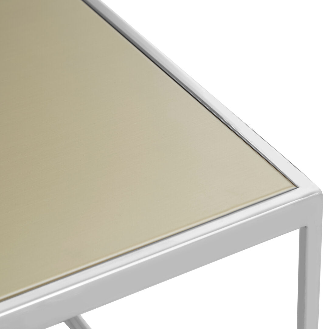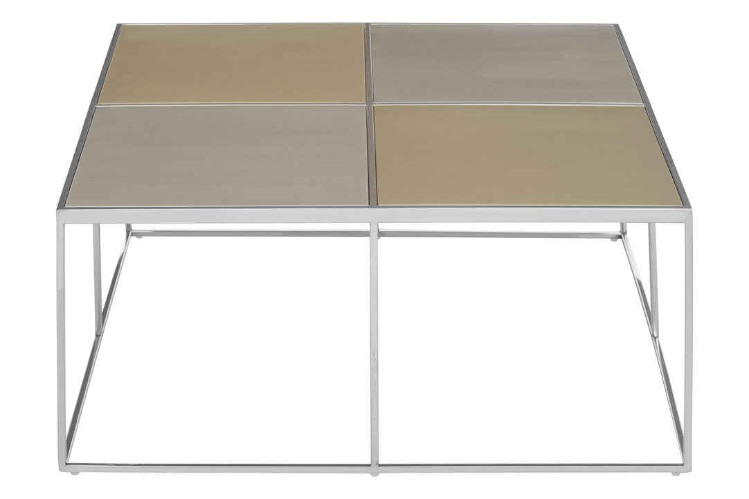 A refined interplay of tone, texture, and structure, this coffee table brings understated sophistication to contemporary living spaces. The tabletop is composed of four warm brushed metal panels, each subtly varied in tone to create depth and visual interest without overwhelming the space. The softly reflective surface catches the light beautifully, offering a gentle sheen rather than a high-gloss finish, which lends the piece an elegant, design-led presence. The clean geometry and balanced proportions make it a natural fit for modern interiors where materiality and restraint take centre stage.