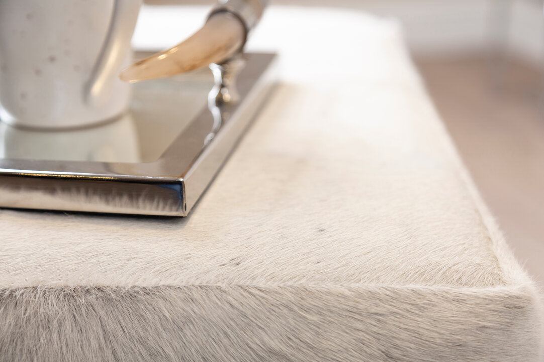 Refined and architecturally composed, this piece introduces a sense of quiet structure to contemporary interiors. Its elongated silhouette is defined by clean lines and balanced proportions, creating a sculptural profile that feels both purposeful and elegant. Upholstered in smooth grey leather, the surface offers a subtle interplay of tone and texture, celebrating premium materials with a distinctly modern sensibility. Polished silver detailing adds a refined contrast, catching the light and enhancing the bench’s tailored aesthetic. The result is designer furniture that feels intentional and sophisticated, aligning seamlessly with high-end interior design and minimalist styling where form and material take precedence.