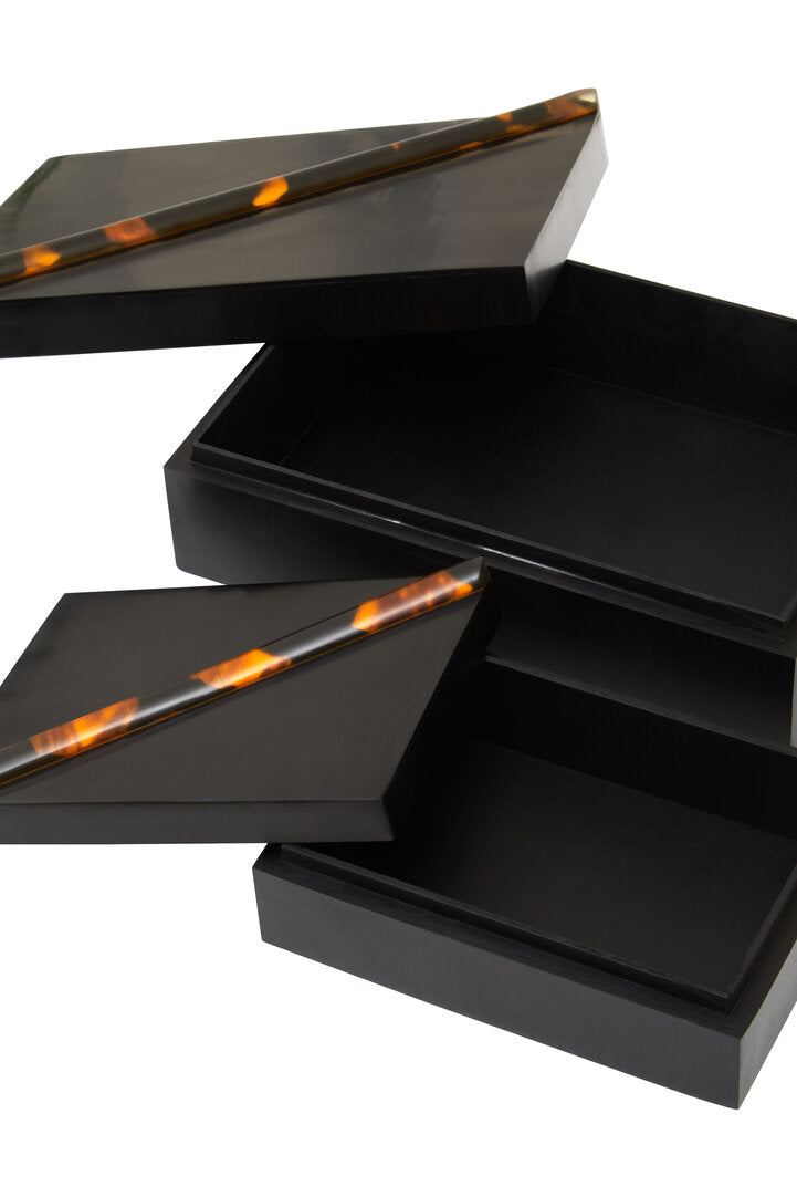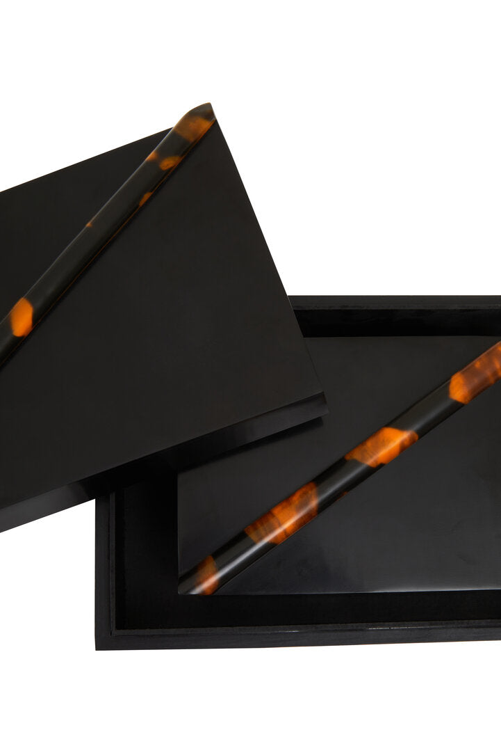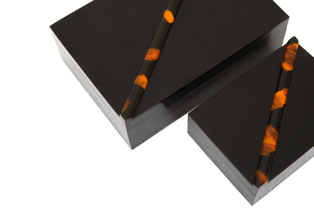 A rich interplay of depth, pattern, and contemporary refinement defines this striking duo. The warm, amber-toned tortoise shell finish brings a softly mottled texture that feels both timeless and modern, introducing an elevated layer to luxury home decor and contemporary interiors. Clean lines and a subtly elongated silhouette give each box a sculptural quality, making them ideal for minimalist styling on consoles, coffee tables, or open shelving. Their glossy surface catches the light in a gentle, atmospheric way, adding warmth and visual interest without overwhelming a space.