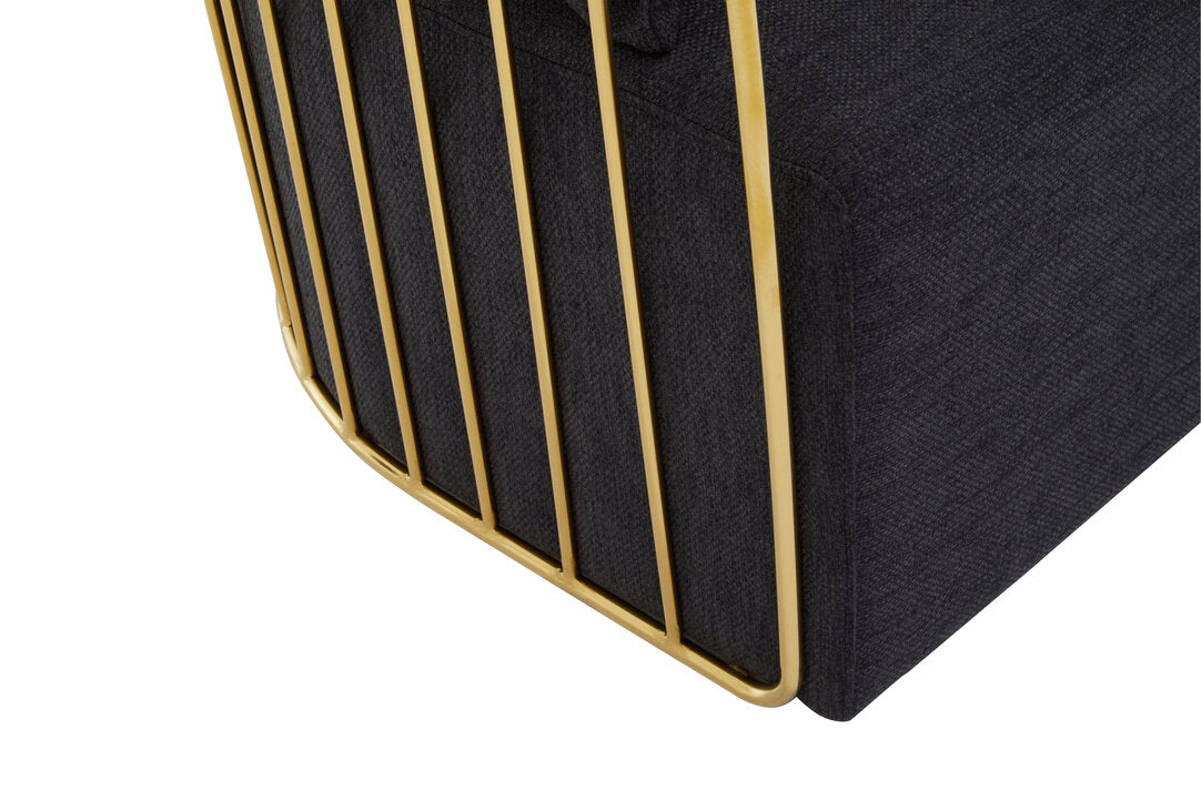 Embodying a refined interplay of structure and softness, this two-seater sofa introduces a sophisticated focal point to contemporary interiors. Its sculptural silhouette pairs clean, linear contours with a warm brushed-gold framework, creating an architectural presence that feels both modern and timeless. Deep black upholstery adds a tactile richness, offering a plush contrast that elevates luxury home decor while complementing premium materials such as marble, smoked glass, and dark timber. The considered proportions and gentle curvature echo the elegance of designer furniture, grounding living spaces with a calm, editorial mood ideal for modern home styling.